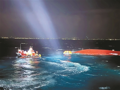 图为2月12日,韩国海警在韩国济州岛附近海域搜救。一艘载有10人的韩国渔船当日晚在济州岛西归浦附近海域倾覆,目前包括船长在内的5人已获救。