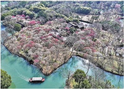 目前,西溪湿地梅花已迎来最佳赏梅时期,到了3月中旬,预计美人梅也将大规模开放,感兴趣的市民游客可以去西溪湿地赏花踏春。记者 李忠 摄
