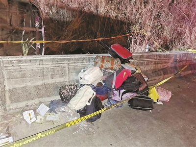 图为媒体2月26日在泰国巴真府拍摄的巴士翻车事故现场的物品。据巴真府道路安全指挥中心消息,一辆旅游巴士当天在该府发生翻车事故,已造成17人死亡、32人受伤。