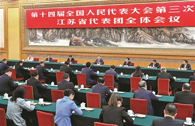 在听取大家发言后,习近平作了发言。他首先表示赞成政府工作报告,对江苏工作予以肯定,希望江苏落实好挑大梁的责任,努力取得新的更大成绩。
