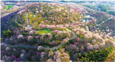 这几天,在位于余杭区瓶窑镇塘埠村的杭州樱花园里,各色樱花竞相绽放,连绵数个山头,为这片青山绿水的美丽乡村平添春日的浪漫,吸引市民游客纷至沓来。樱花园占地600余亩,栽种了40多个品种的近6万株樱花,从早樱到晚樱依次盛开,花期长达45天左右。记者 李忠 摄