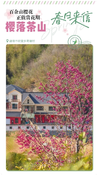 樱落茶山,春信满枝。眼下,位于建德市钦堂乡葛塘村樱花茶园的百余亩樱花树绽放一抹抹嫣红,奏响了春天的序曲。