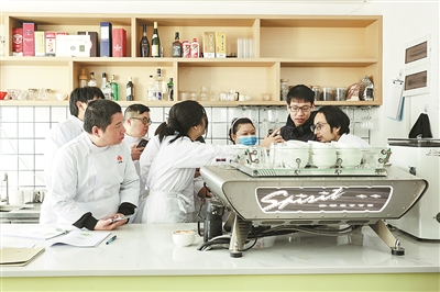 在咖啡教室内,学员们正认真学习咖啡机的用法,手语老师也在一旁随时翻译。“这十多天内,我们会把咖啡制作、拉花制作、奶泡打发都进行系统培训,他们培训完成后去考个中级咖啡师证,或是在咖啡店内上班是没问题的。”咖啡饮品课程的教师李星龙说。