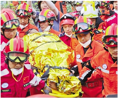 据新华社缅甸曼德勒4月2日电(记者 才扬 蒋超)4月2日,在缅甸曼德勒,中国救援队伍救出一名幸存者(右图)。