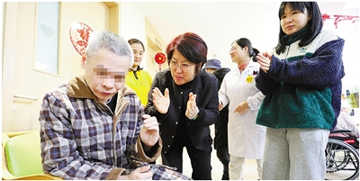 托养服务中心工作人员引导徐晓做拍手操。记者 许卓恒 摄