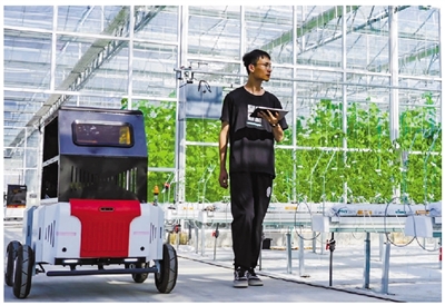 “这个机械手臂叫‘码垛机器人’,效率可高了,一个小时可以叠720盘幼苗。”“农创智谷”技术人员郑锦飞介绍。这个智慧农场由上虞区农业农村局投资建设,总投资1000余万元,通过引入农业机器人、农业综合数据管理系统等,实现了对土壤、气象、作物生长环境等方面的实时监测和精细管理。“目前玻璃温室只需要一台电脑或手机,就能全程实现自动种植、采收、包装等。”