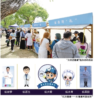 现场,市卫生健康委发布“杭向健康——AI健康科普矩阵”,杭医生、杭小育、杭好梦、杭职防、杭大爱五个人工智能体亮相,为市民提供健康评估、个性化养生等多项服务;大草坪上,八大“健康+”展台吸引市民沉浸式观摩、体验“家门口”的健康生态圈。