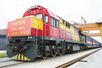 2024年3月8日,在广西南宁国际铁路港,一列满载340吨电力铁塔的中越班列从南宁国际铁路港开出,发往越南河内。新华社记者 曹祎铭 摄