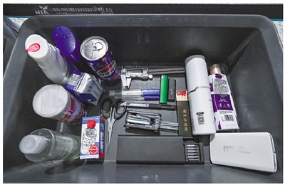 筐内物品各式各样,八宝粥、温度计、火柴盒、发胶喷雾、饮料瓶、标识不清的充电宝、折叠刀具、打火机……“都是上午刚查获的,这还只是一部分。”安昊毅告诉记者,每天查获的打火机和刀具数量最多,约有300个。