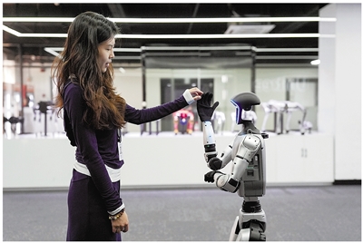 4月23日,在机器人公司杭州宇树科技展厅内,宇树人形机器人G1展示刚“学会”的模仿动漫角色奥特曼的“光波”动作。新华社记者 黄宗治 摄