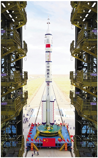 神舟二十号载人飞船与长征二号F遥二十运载火箭组合体在垂直转运中。新华社发