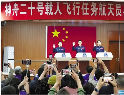 4月23日,神舟二十号载人飞行任务航天员陈冬(中)、陈中瑞(右)、王杰在酒泉卫星发射中心问天阁与媒体记者集体见面。 新华社发(韩启扬 摄)