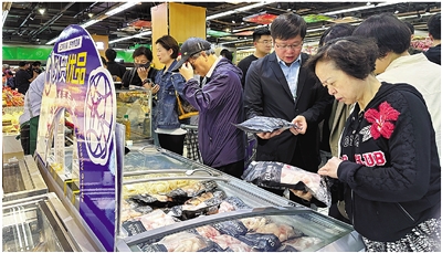 我在专区旁观察了一个多小时,发现每公斤价格为152元的阿根廷红虾很受大伯大妈们欢迎,他们一边试吃,一边往购物篮里放东西。“这么好的进口海鲜,我们老百姓消费得起,当然要买点吃吃啦!”“毛鲜嘞!我等下挑完菜再来拿一包……”当天上午,水产区的服务人员又给柜台补了一次货。
