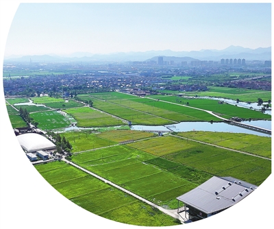 从绍兴鉴水科技城东北侧上空俯瞰,占地近1700亩的“智祚农谷”绿意盎然,无人机不久前播撒下的稻种已经发芽,田间地头一派生机勃勃的景象。