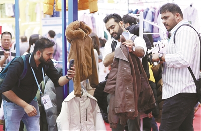 5月1日,境外采购商在一家服装企业的展区拍摄样品。