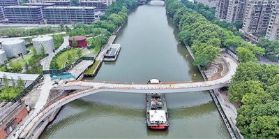 5月15日,随着小河公园跨运河人行桥的东岸梯道梁吊装到位,呈优美曲线的整座人行桥主体结构基本完成,下一步将进行桥栏安装、桥面铺装及周边配套等施工,预计今年8月底前建成。