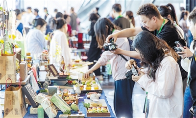 杭州知味观的糕点和国潮文创产品展台前同样人气高涨,嘉宾们纷纷品鉴、欣赏。市商旅运河集团副总经理沈杨根介绍:“我们从杭州带来定胜糕、荷花酥等经典糕点,尤其想和大家分享融合龙井茶、茉莉、桂花及九曲红梅的四季茶酥,让茶香与糕点完美交融。”文化学者、中央民族大学教授蒙曼认真看后也不禁赞叹:“知味观的糕点精致得不得了!”
