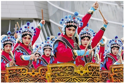 29日,法国巴黎著名休闲游乐园巴黎风情园内,由125人组成的“陕西神木杨家鼓”表演团队敲响战鼓(上图)。铿锵激昂的鼓声伴随热烈掌声和欢呼声,将现场气氛推向高潮。
