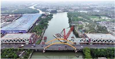 东西大道运河大桥改造工程项目位于余杭、临平两区交界处,在现运河桥北侧新建一座上跨京杭大运河的整幅双层桥。该项目全长1.01公里,主桥长300米,上层是中环快速路组成部分,为双向六车道,下层为双向六车道+非机动车道+人行道的城市主干路。该桥是浙江省首座大跨径双层钢桁架拱桥,建成后将成为连接余杭区与临平区的重要交通枢纽。记者 李忠 摄