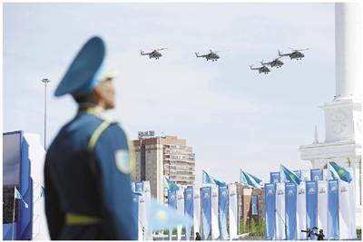 2025年5月7日,哈萨克斯坦在首都阿斯塔纳举行盛大阅兵式,纪念世界反法西斯战争胜利80周年,并庆祝祖国保卫者日。新华社发(奥斯帕诺夫 摄)