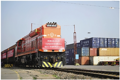 2025年5月20日,2025年首列天津港经霍尔果斯直达乌兹别克斯坦首都塔什干的中亚班列从天津港物捷三堆场发车。 新华社记者 赵子硕 摄