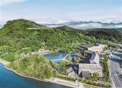 置身“地道吴越”非物质文化遗产体验中心,临窗远眺,隔着潺潺碧水,便是功臣山。目之所及,水清岸绿,还有夯土块石墙、曲面悬山顶,建筑错落有致,与山水自然交融。
