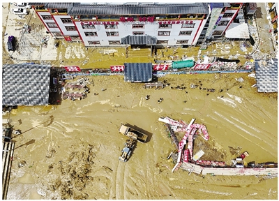 图为6月25日,大型设备在贵州省榕江县“村超”球场进行清淤(无人机照片)。