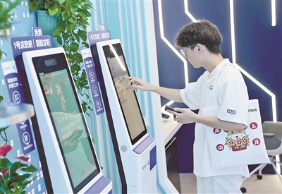 6月28日,求职者在招聘会现场的AI智能面试专区操作自助式智能求职机。