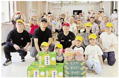 志愿者和孩子为临浦颐养中心的老人送去玉米和小番茄。浙江省阳光爱心公益服务中心供图