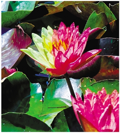 晨光初绽,湖面上的薄雾还未散尽,双色睡莲便已悄然睁开了惺忪的睡眼,在粼粼波光中舒展身姿,如梦如幻。双色睡莲多见于“万维莎”“粉色黎明”等品种,除此之外,岛上还有数十种睡莲正在开放。