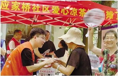 早晨八点半,河东路上的应家桥社区凉茶摊出摊了:熟悉的搪瓷大壶,罗汉果、陈皮、荷叶、金银花等配出的经典配方,散发着阵阵清香。一位身着校服的学生路过,接过一杯凉茶,迫不及待猛灌几口;路边快递车旁,骑手捧着茶杯站在树荫下,享受着清凉。据了解,应家桥社区凉茶摊每年从7月初开始摆放至8月底,至今已有10年。