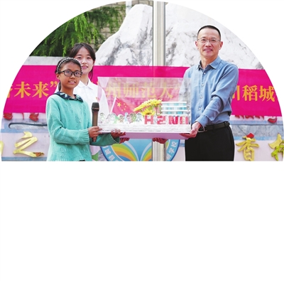 美术课上,一个叫西绕卓格的孩子在自己的美术作业本上画下了稻城著名的雪山,并在旁边写了一句让人莞尔的话:“希望杭州也能有雪山。”在支教第三天的“蓝系浙甘·书香未来”公益捐赠仪式上,这群孩子真的把“雪山”作为回礼送给了老师——它以稻城三座雪山为背景,矗立着杭师大标志性的书本状建筑模型;前面环绕着小朋友和11位支教老师,后方则插着一面鲜艳的红旗和“民族大团结”的字样,旁边点缀着从学校劳动教育基地带来的向日葵。