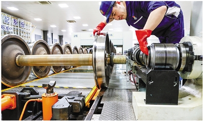 “60吨轮对的轴承与轴径的配合过盈量要在0.050到0.102毫米之间,过大或过小都会引发切轴等事故。”在长三角铁路最大的铁路货车车辆检修基地杭州北车辆段乔司检修车间压装间内,轮轴装修工严林峰手握内径千分尺,一丝不苟地进行着测量工作,深蓝色工作服后背,已洇开一片深色的汗迹,紧紧贴在身上。