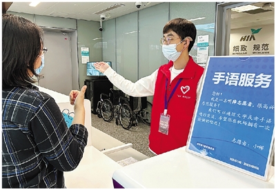 缪宏杰为旅客指路,旅客用手语“谢谢”表达感谢。
