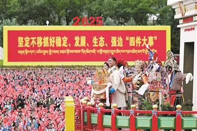 8月21日上午,西藏各族各界干部群众约2万人欢聚拉萨市布达拉宫广场,热烈庆祝西藏自治区成立60周年。这是游行的彩车通过布达拉宫广场。 新华社记者 谢环驰 摄