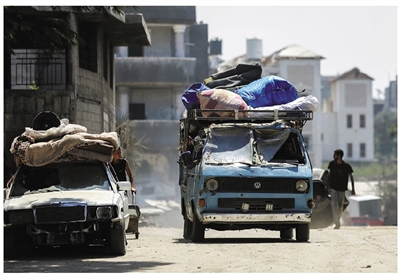8月22日,巴勒斯坦民众携带物品驾车离开加沙城向南撤离。由于加沙城面临以色列军队的新一轮攻势,大批加沙城居民向加沙南部地带撤离。 新华社发(里泽克·阿卜杜勒贾瓦德 摄)