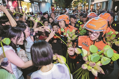 骑士将莲蓬荷花送给市民游客。