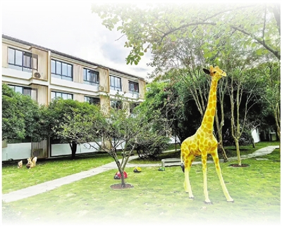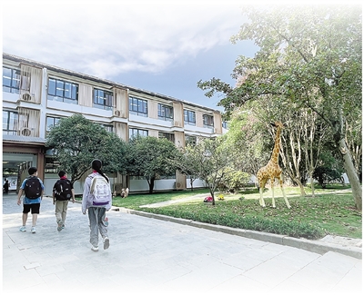校园的中式大门,散发着浓浓的古风。蓝天白云之下,融入周边景区之中,氛围感十足。学生们快步走进校门,教学楼前近三米高的长颈鹿雕塑、躲在草丛里的兔子等动物造型,一路吸引着他们的眼球,又让他们忍不住放慢脚步。