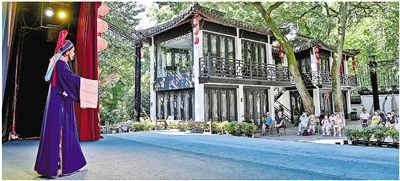 黄龙洞的舞台是个全年无休的“戏台子”。365天,无论酷暑寒冬,不管台下是座无虚席还是寥寥数人,锣鼓点一响,演员们就准时登场。杭州前几日高温肆虐,舞台像扣了个蒸笼,可当伴奏音乐响起,陈洋的唱腔穿透闷热空气,清亮又有力道——台下观众摇着折扇的手慢了下来,目光全被台上的身段、唱腔勾住,连暑气都似被这股杭韵驱散了。