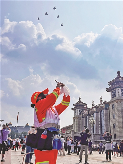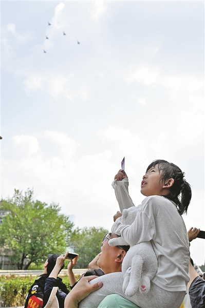 9月3日,纪念中国人民抗日战争暨世界反法西斯战争胜利80周年大会在北京隆重举行。这是市民在观看空中梯队。 新华社记者 陈浩明 报道员 张天宇 摄