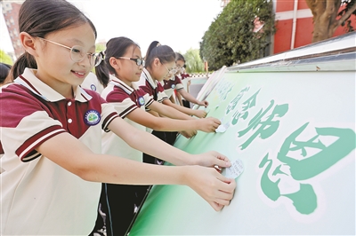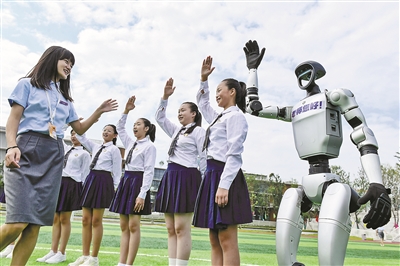 左上图为9月9日,河南省焦作市温县第三实验小学学生在展板上粘贴教师节祝福语。右上图为9月9日,在四川师范大学附属生物城学校操场,一台人形机器人和学生一起向老师问好。