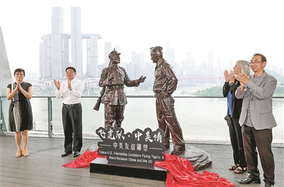 近日,在重庆国际会客厅,飞虎队陈纳德将军的孙女帕蒂·卢·陈纳德·史密斯(右二)等嘉宾为“飞虎队·中美情”雕塑作品揭幕。