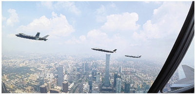9月3日,纪念中国人民抗日战争暨世界反法西斯战争胜利80周年大会隆重举行。这是歼击机梯队从北京城区上空飞过。新华社记者 白雪骐 摄