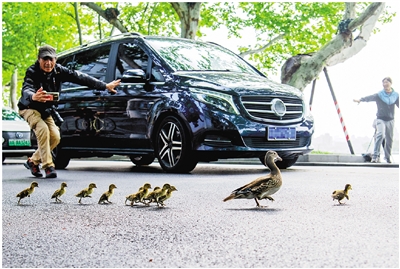 西湖鸳鸯宝宝成功出窝,鸳鸯护卫队暖心护送“一家11口”过马路跃入西湖。杭州网网友“阿六头” 摄