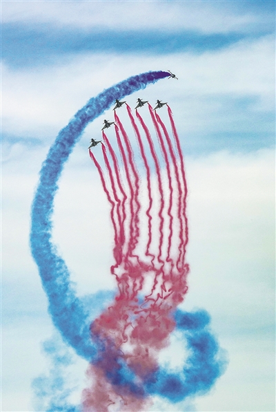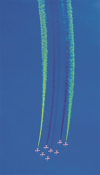 空军航空大学“红鹰”飞行表演队(右上图)进行飞行表演。