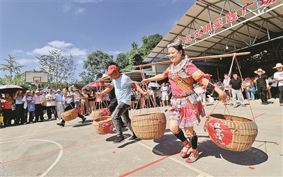 当天,在广西柳州市融安县大良镇良北村年洞屯,农民在进行挑稻谷接力比赛。 新华社发(谭克兴 摄)