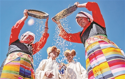 9月23日,在西藏拉萨市林周县强嘎乡典冲村,当地农民用传统方式让青稞脱粒。今年9月23日是第八个中国农民丰收节,各地通过农民丰收巡游、农耕技艺体验、民俗文化展演等活动,同享秋收喜悦,感受中国乡土的蓬勃生机。 新华社记者 丁增尼达 摄