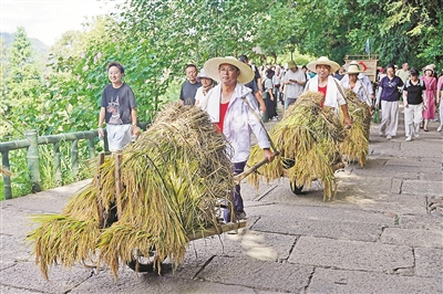 当天,农民在江西省婺源县篁岭景区进行晒丰收巡游。新华社记者 万象 摄