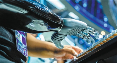 在强脑科技的展台上,工作人员姜颂宁右手佩戴着一只仿生手,正在现场弹奏钢琴。他右手的每一次按键,都不是预设的程序指令,而是直接响应其大脑的意图。