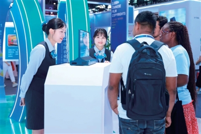 数贸会现场,农行浙江杭州分行工作人员通过“多语种翻译机”为外籍客户讲解。